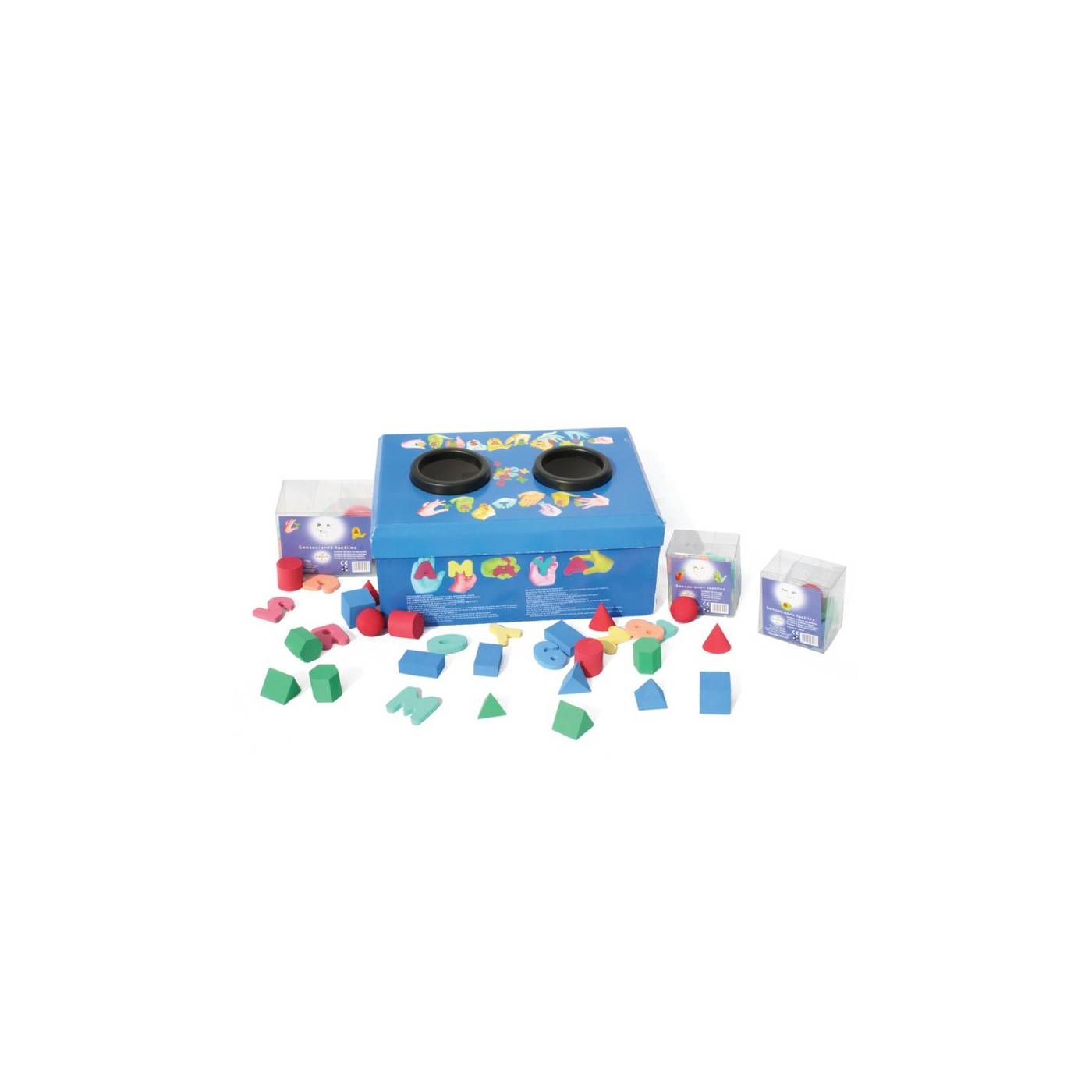 El niño desarrolla jugando el sentido del tacto, aprendiendo a diferenciar diferentes figuras geométricas así como las letras del abecedario y los números. Contiene 9