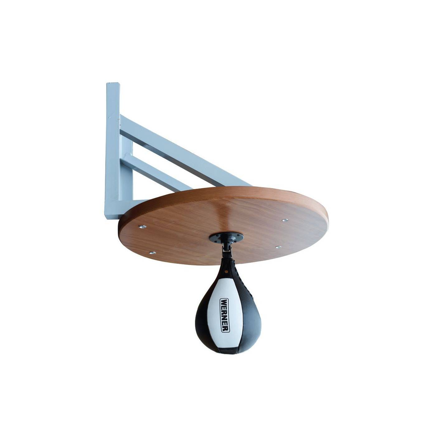 Material: acero y tablero de madera. Apoyo de acero, con rodamiento. Para ejercitar la velocidad en el boxeo. Ø 60 cm. x 3 cm.