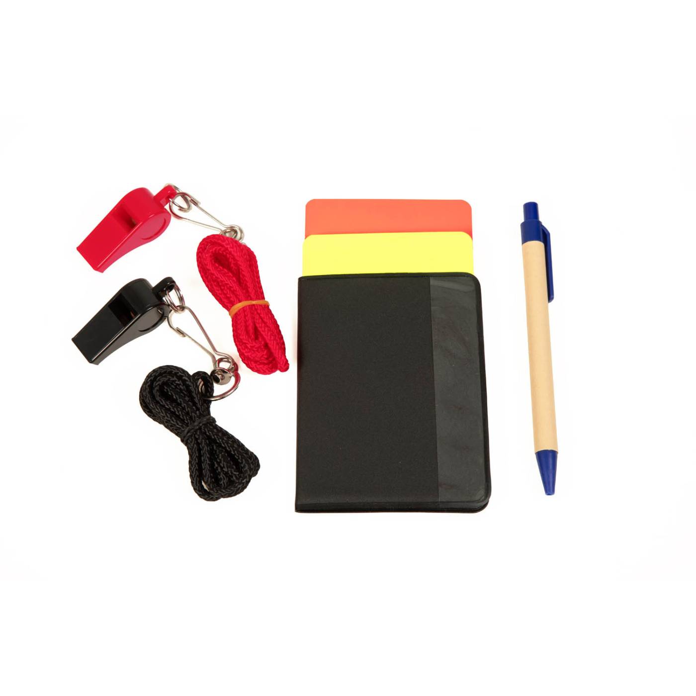 Este set de árbitro incluye los elementos básicos para dirigir partidos y actividades deportivas: tarjetas roja y amarilla, bloc de anotaciones y silbato. Es ideal para clases de educación física, entrenamientos, competiciones escolares o partidos recreativos.