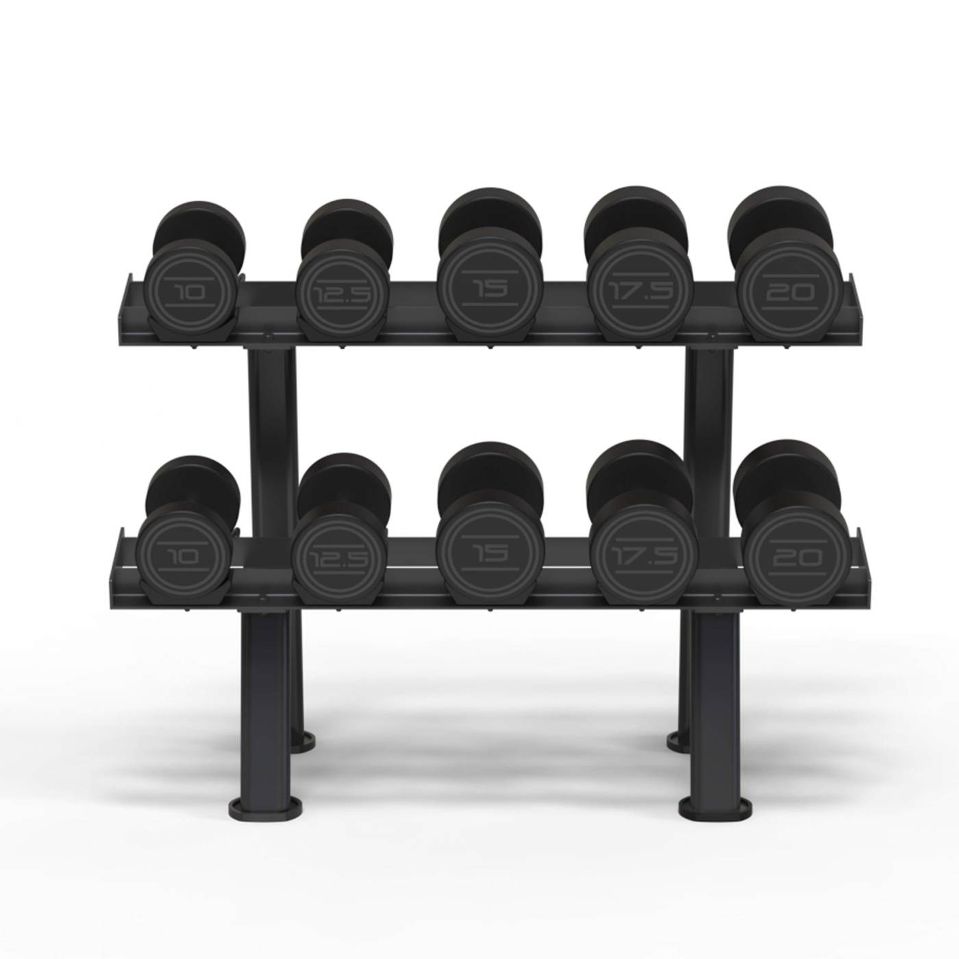 Soporte mancuernas 2 alturas - Capacidad 5 pares Estructura diseñada para el almacenamiento y la organización de mancuernas redondas clásicas. Está disponible en dos tamaños con capacidad para 5 y 10 pares en dos alturas, lo que aporta a este modelo gran versatilidad y adaptabilidad a casi cualquier espacio. Gran precisión de diseño, acabados perfeccionados, aportando sofisticación y funcionalidad.