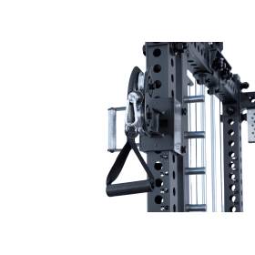 Combina power rack, doble torre de poleas ajustables y barra Smith guiada, todo integrado en una estructura compacta y extremadamente estable. Su chasis de acero sobredimensionado, junto con poleas de aluminio mecanizado y guías cromadas de alta precisión, garantiza un movimiento fluido, silencioso y consistente incluso bajo cargas elevadas.
