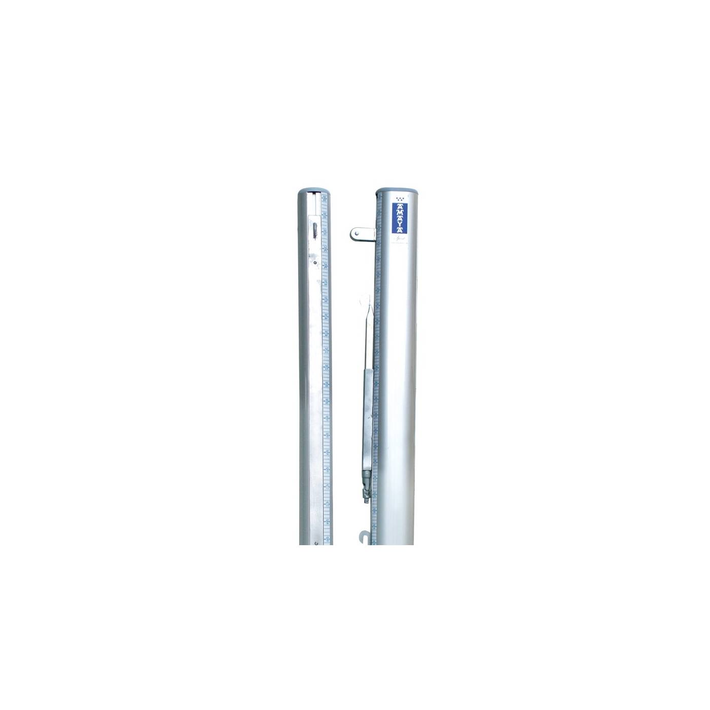 Postes de Voleibol de competición fabricados en perfil de aluminio anodizado de 140 mm. x 100 mm.. Con refuerzos interiores para mayor robustez. Sistema de tensado de red integrado en los postes mediante un carro regulable en altura, fabricado en acero zincado. Admite el tensado de red en las diferentes alturas oficiales dependiendo de la categoría, además de altura para bádminton y tenis. Incluye sistema de anclaje al suelo. Acorde a la normativa UNE-EN 1271:2004